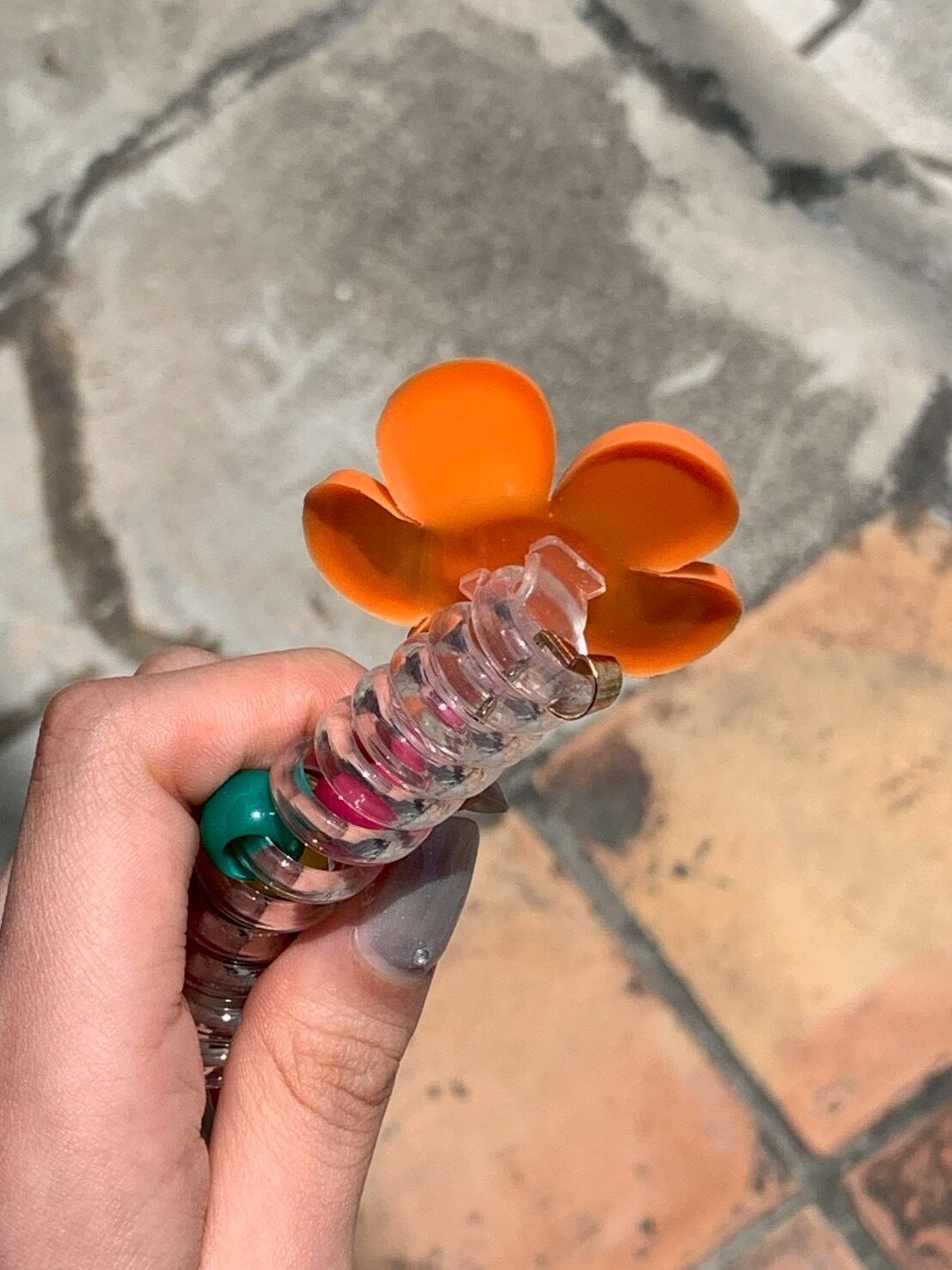 にこちゃんフェイスのお花モチーフと、くるくるしたコイルデザインがポイント。髪にやさしくフィットし、結び跡がつきにくいのも嬉しい特徴です。軽くて使いやすく、デイリー使いはもちろん、お出かけやちょっとしたまとめ髪にもぴったり。